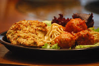 Eggplant, whole grain spaghetti, onions, Organic green and purple "leaves", Meatballs, and tomato based sauce.